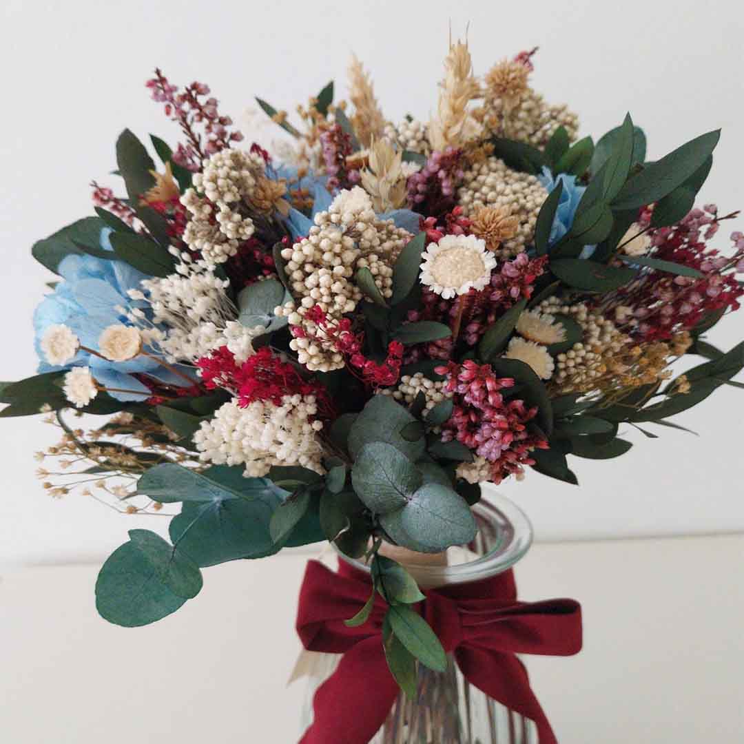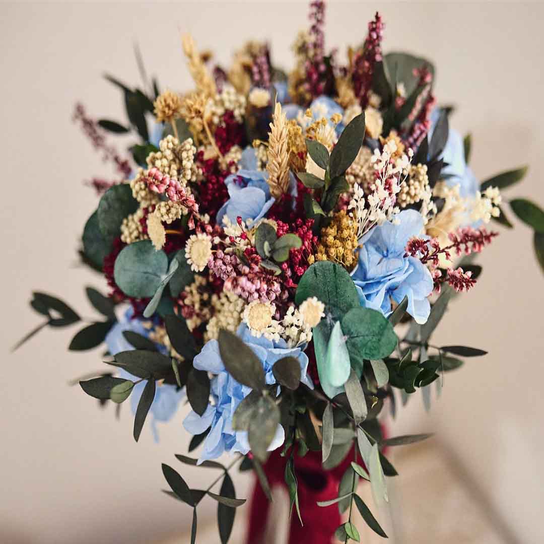 Un ramo romántico y atemporal que combina hortensias celestes de intenso color, eucalipto preservado y delicadas flores secas, creando una estética elegante y con alma vintage que perdura para siempre.